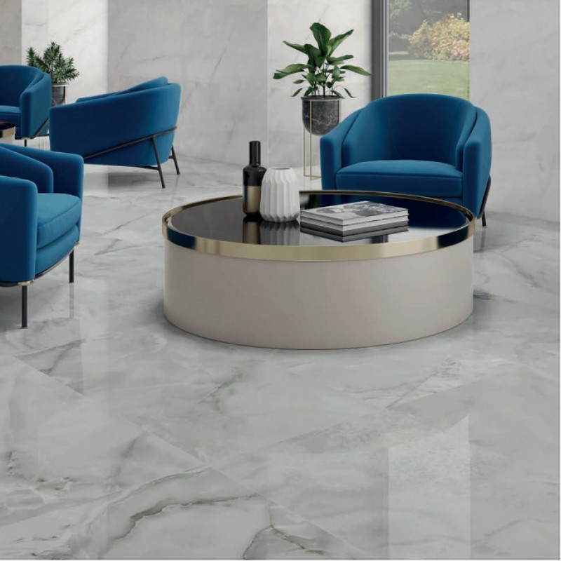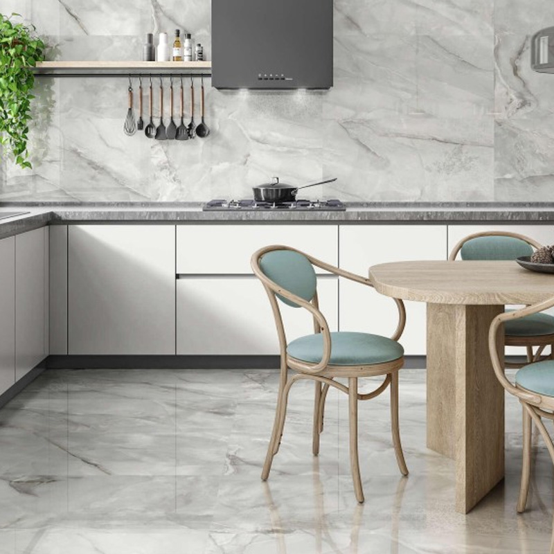 Carrelage rectifié 60 × 60 cm, finition brillante gris clair, qualité A, idéal sols & murs intérieurs haut de gamme – disponible chez Vistacer.